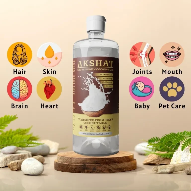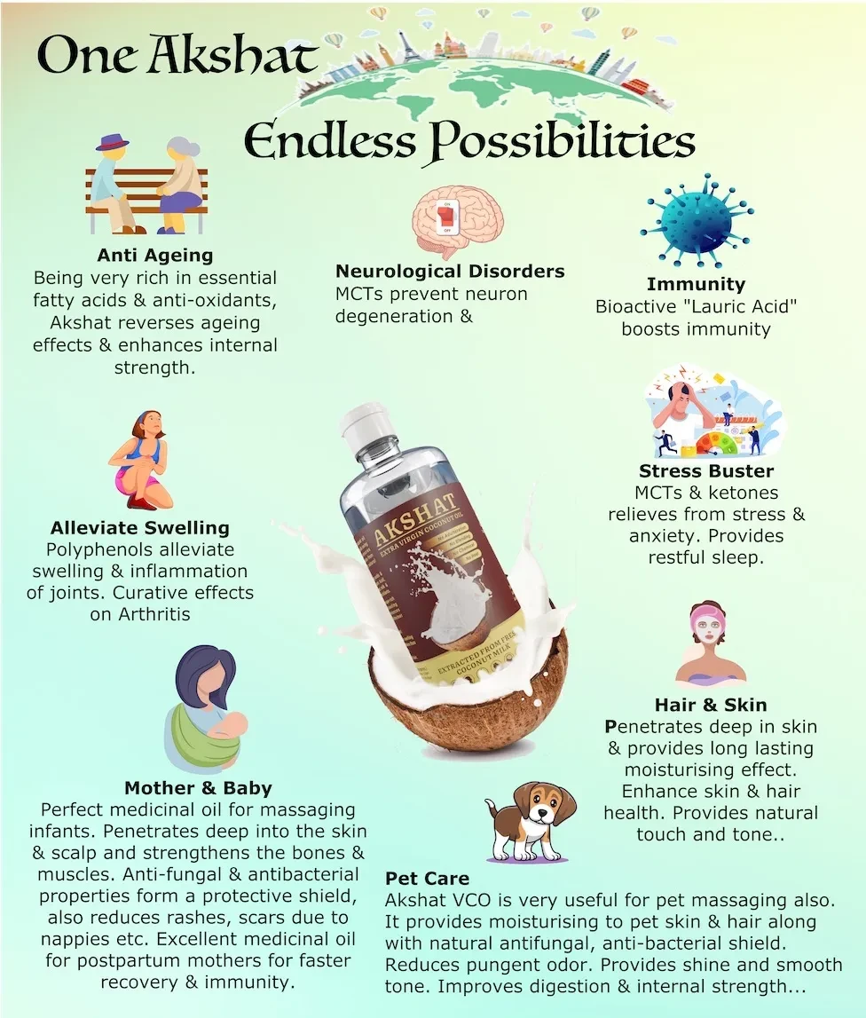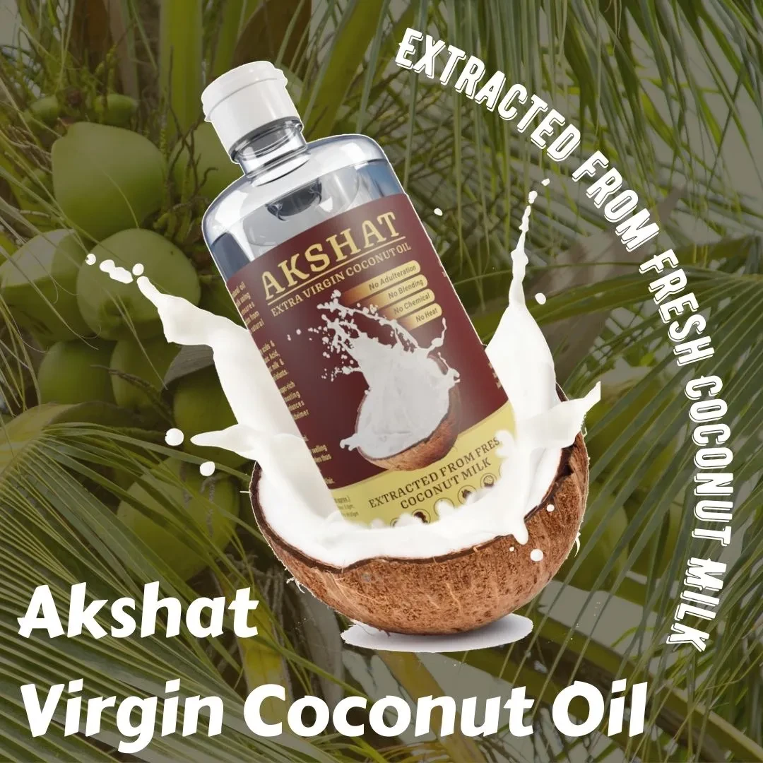 Akshat VCO is a 100% pure virgin coconut oil extracted from fresh coconut milk using the centrifuge method. No chemicals or external heat is used thus all the nutrition & goodness in coconut milk is obtained in the oil as it is.