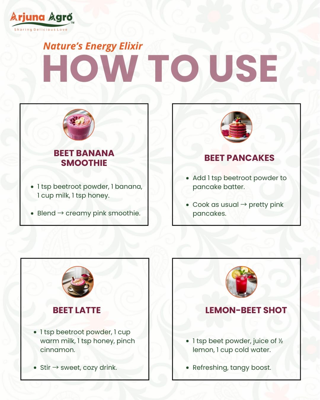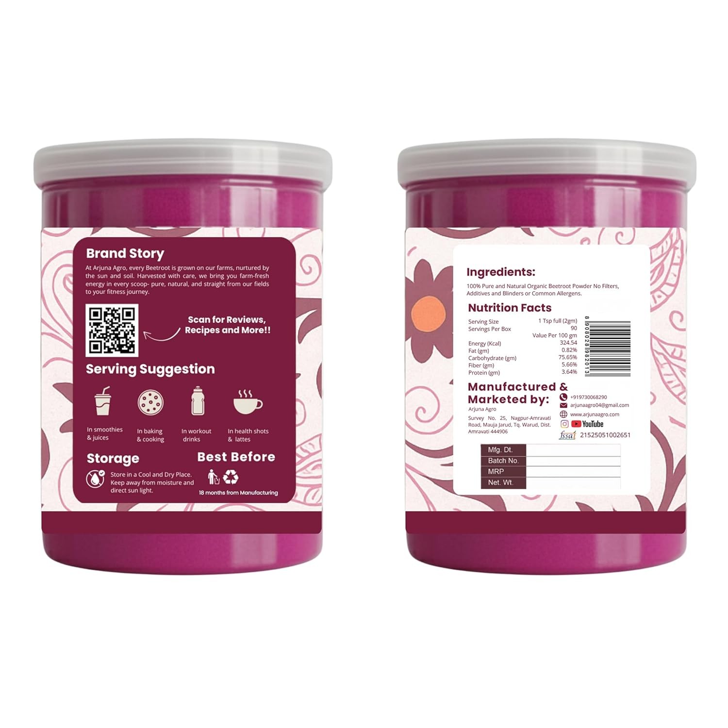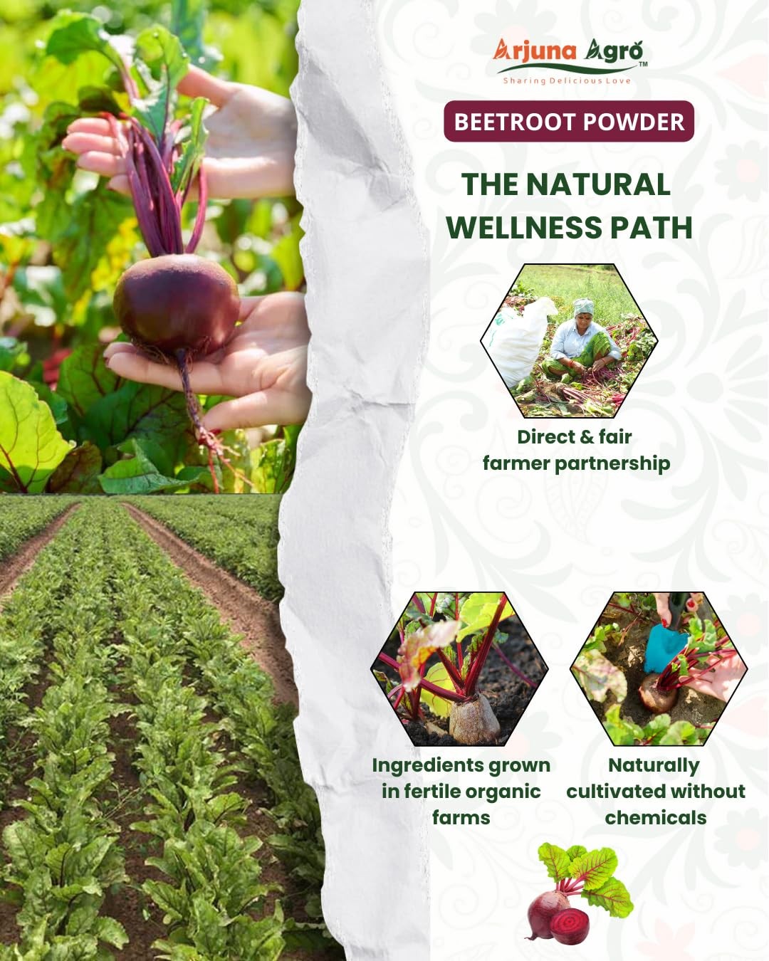 Arjuna Agro Beetroot Powder is a finely ground vegetable powder made from selected beetroots. The powder retains its natural color and smooth texture, making it easy to blend into drinks or recipes. Free from additives and preservatives, it offers a clean, single-ingredient option for those who prefer minimal processing and versatile kitchen use.