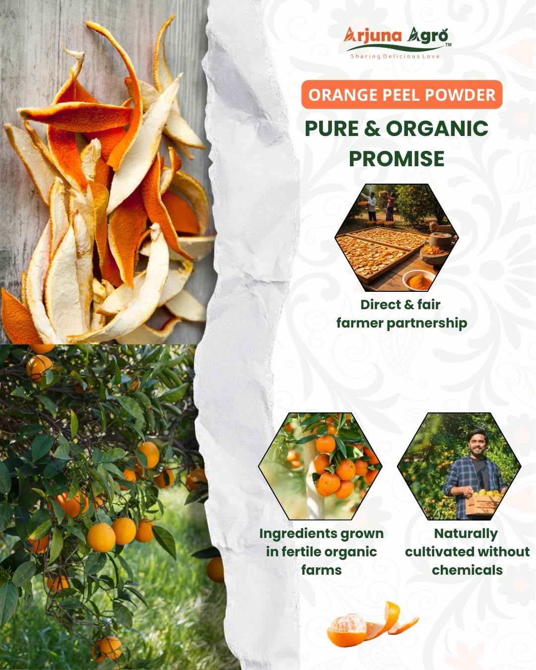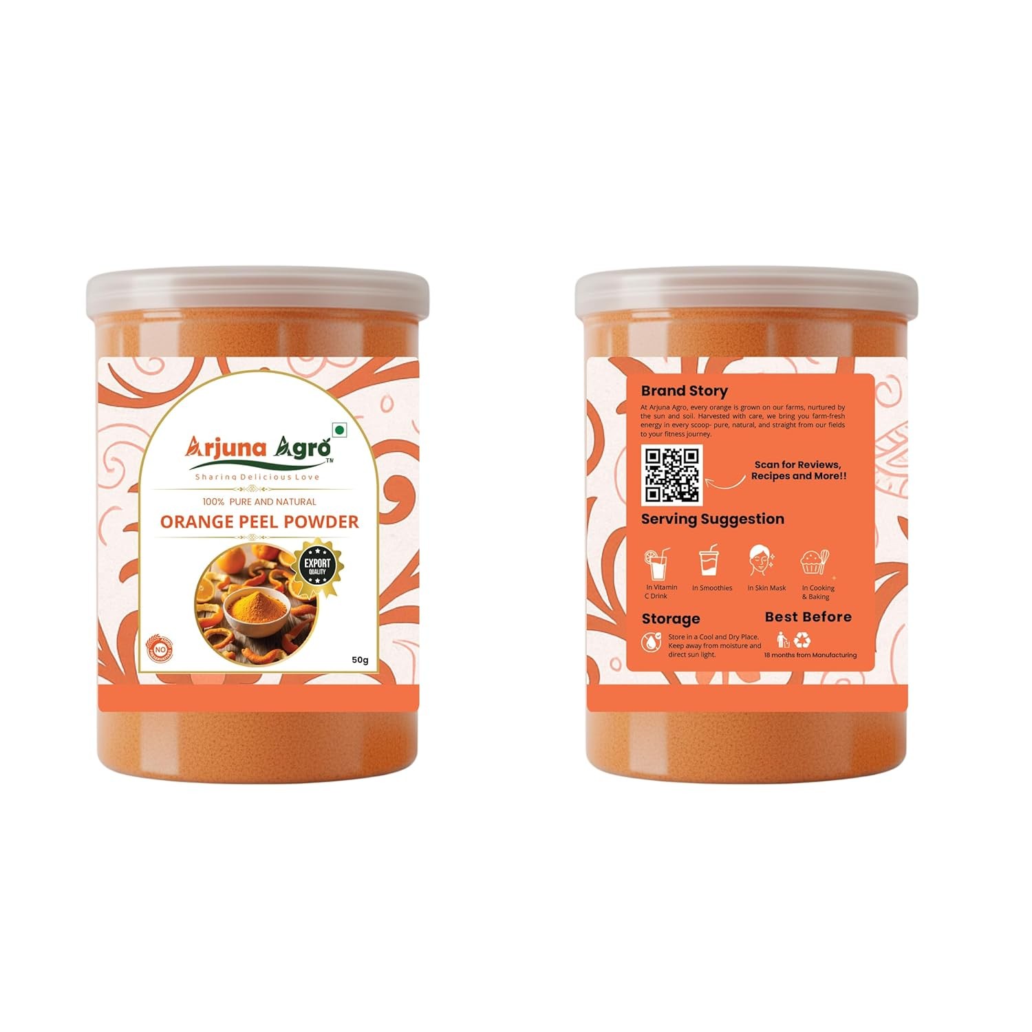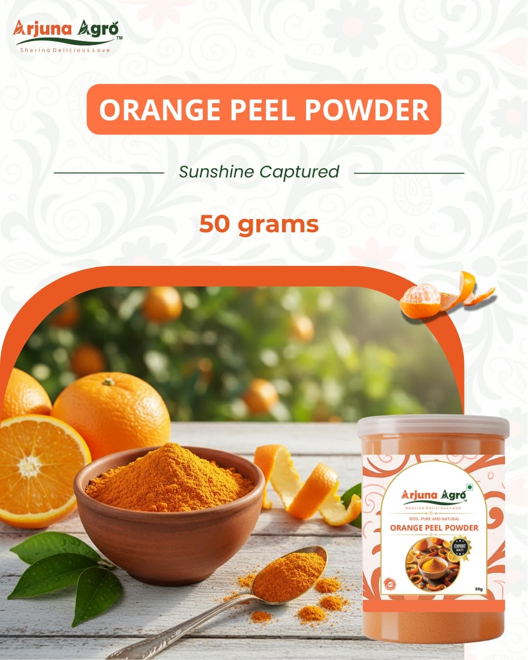 Arjuna Agro Orange Peel Powder is made from carefully selected orange peels that are dried and finely ground to preserve their natural aroma and citrus properties. It is a versatile, plant-based powder commonly used in traditional skincare routines and home remedies. Widely used in DIY face packs and hair masks, orange peel powder helps cleanse the skin and refresh the scalp when used externally as part of a regular care routine. Its natural citrus profile also makes it suitable for culinary experimentation, such as flavoring herbal teas, baked goods, and homemade blends. This powder is free from artificial colors, preservatives, additives, and fillers. It blends easily with water, rose water, yogurt, or other natural ingredients, making it a simple addition to personal care or kitchen use. How to Use: For external use, mix with water or natural bases to prepare face or hair packs. For culinary use, use in small quantities as per taste. Net Quantity: 50 g 100% Natural | Vegan | No Added Preservatives