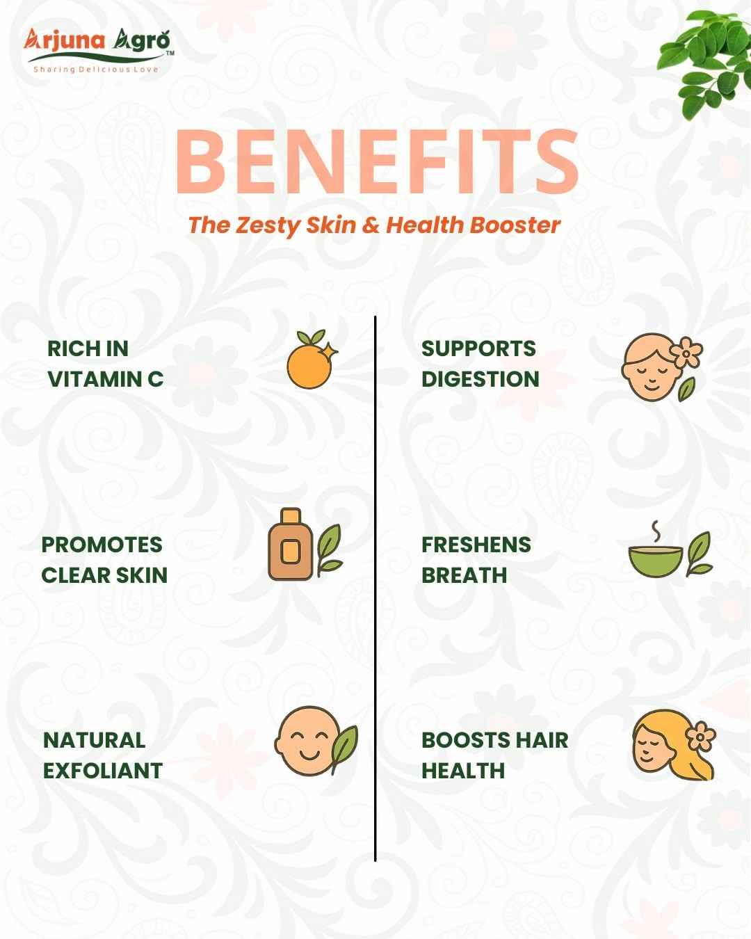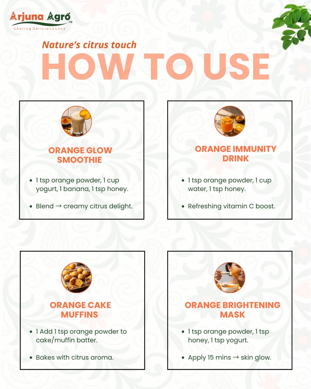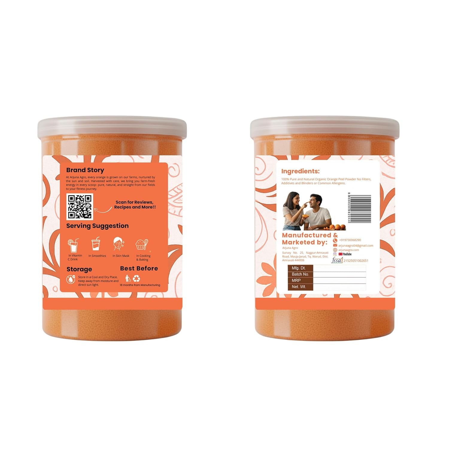 Arjuna Agro Orange Peel Powder is made from carefully selected orange peels that are dried and finely ground to preserve their natural aroma and citrus properties. It is a versatile, plant-based powder commonly used in traditional skincare routines and home remedies. Widely used in DIY face packs and hair masks, orange peel powder helps cleanse the skin and refresh the scalp when used externally as part of a regular care routine. Its natural citrus profile also makes it suitable for culinary experimentation, such as flavoring herbal teas, baked goods, and homemade blends. This powder is free from artificial colors, preservatives, additives, and fillers. It blends easily with water, rose water, yogurt, or other natural ingredients, making it a simple addition to personal care or kitchen use. How to Use: For external use, mix with water or natural bases to prepare face or hair packs. For culinary use, use in small quantities as per taste. Net Quantity: 50 g 100% Natural | Vegan | No Added Preservatives