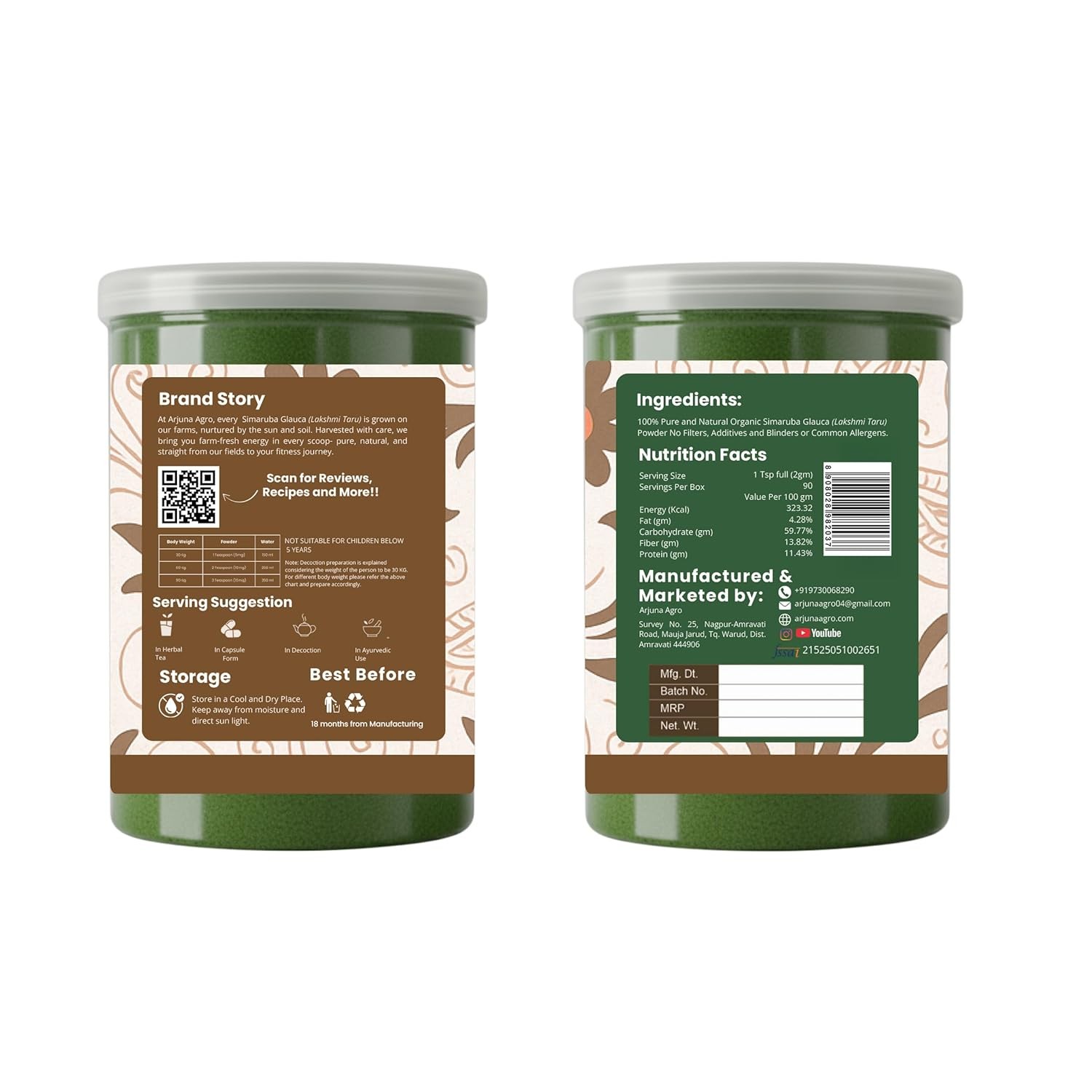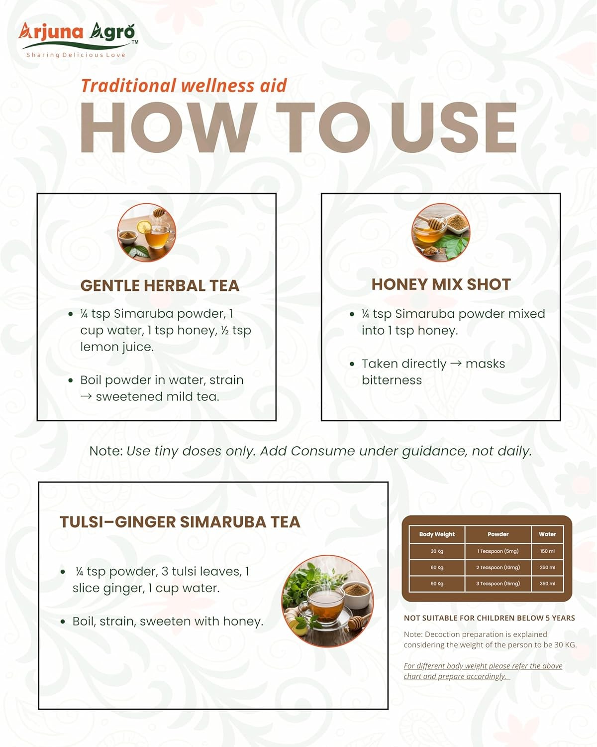 Arjuna Agro Simbarouba Powder is a finely ground herbal powder made from selected simbarouba glauca. The powder is processed without additives, preservatives, or artificial ingredients. Its clean composition and fine texture make it suitable for traditional uses. Hygienically packed to maintain freshness and consistency.