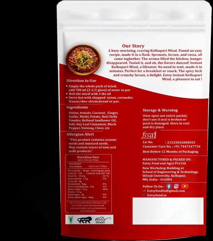 Enjoy authentic Kolhapuri Misal in minutes! Includes Rassa Gravy, Sprouted Moths, and Shev Chivda. Just add 700ml water & boil. 100% natural and extra spicy.