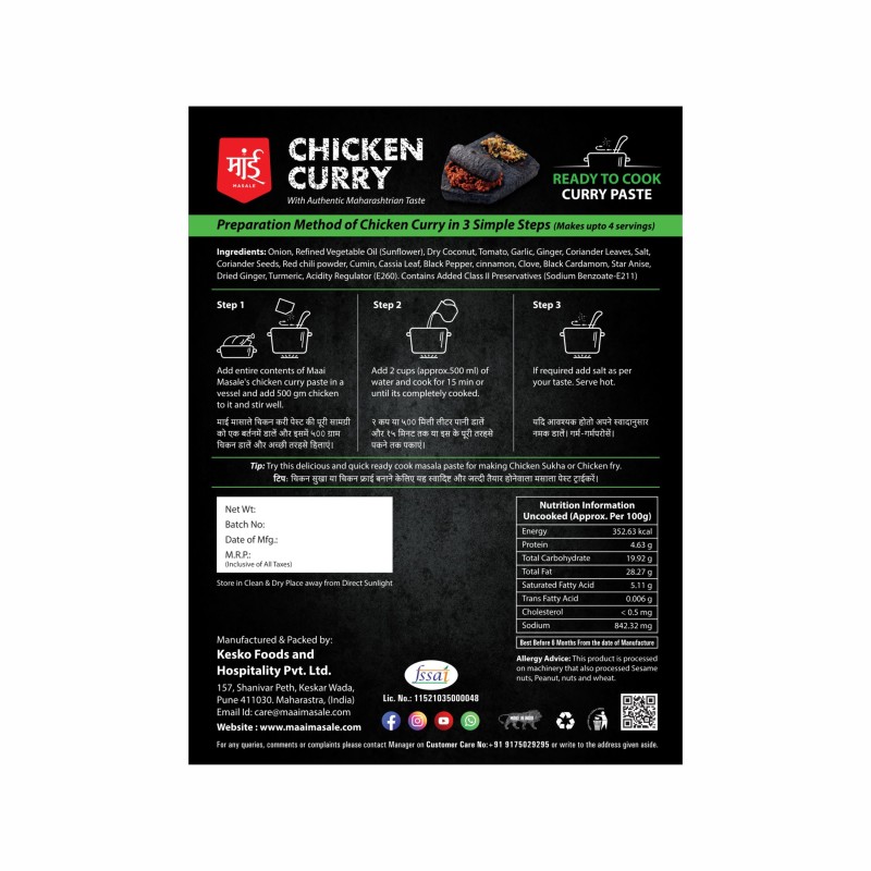 • Chicken Curry, a recipe cooked in several forms throughout Maharashtra. Experience Our unique spice blend Masala Paste and enjoy delicious gravy with tasty Chicken garnished with lemon and onions.